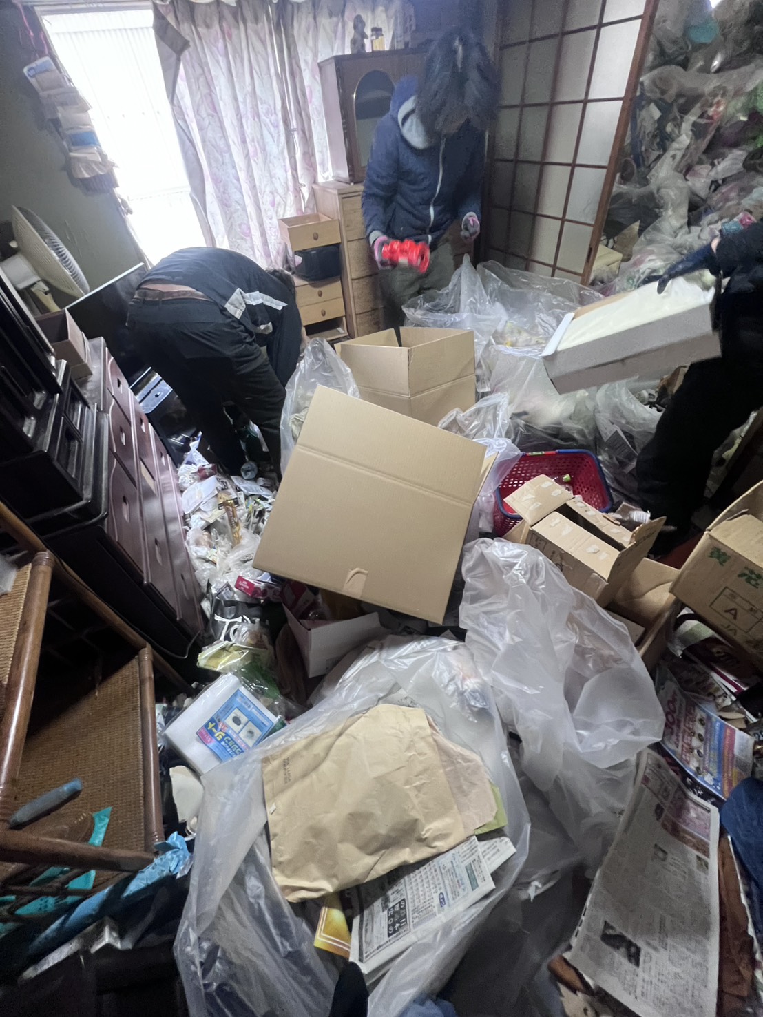 共用動線を確保した後は、家の中でも物量が集まりやすい居室から整理を進めました。居室は「一時置き」が続くと、衣類・生活雑貨・紙類・小物が混ざりやすく、どこから触っても物が動くだけになりがちです。そこで、まず床面の安全を確保しながら、作業の順番を固定して仕分けを進めました。